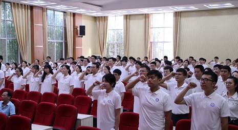 新生干部代表带领全体研究生新生进行学术道德与科研诚信宣誓。这一庄严而崇高的时刻,展示了湖工大材化研究生高昂的精神风貌和严谨的学术理念。