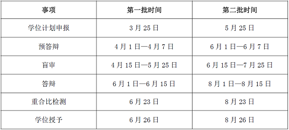2020 年夏季学位授予工作仍按计划申报、预答辩、盲审、答辩、重合比检测、学位授予等流程分两批进行,各环节的结果运用同2019年学位工作方案。若在第一批盲审、答辩、重合比检测等审核环节中被认定为“不合格”论文,论文作者须在导师指导下,对论文做不少于六个月的重大修改后,重新参加论文审核。具体时间节点请见下表。