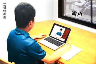次机位为监控机位,放于考生侧后方45度,用于考官和视频监考员在面试过程中观测考生的桌面、后方及周边环境情况。次机位摄像头覆盖窗户(房间无窗则不做要求),关闭次机位的麦克风。示意图如下: