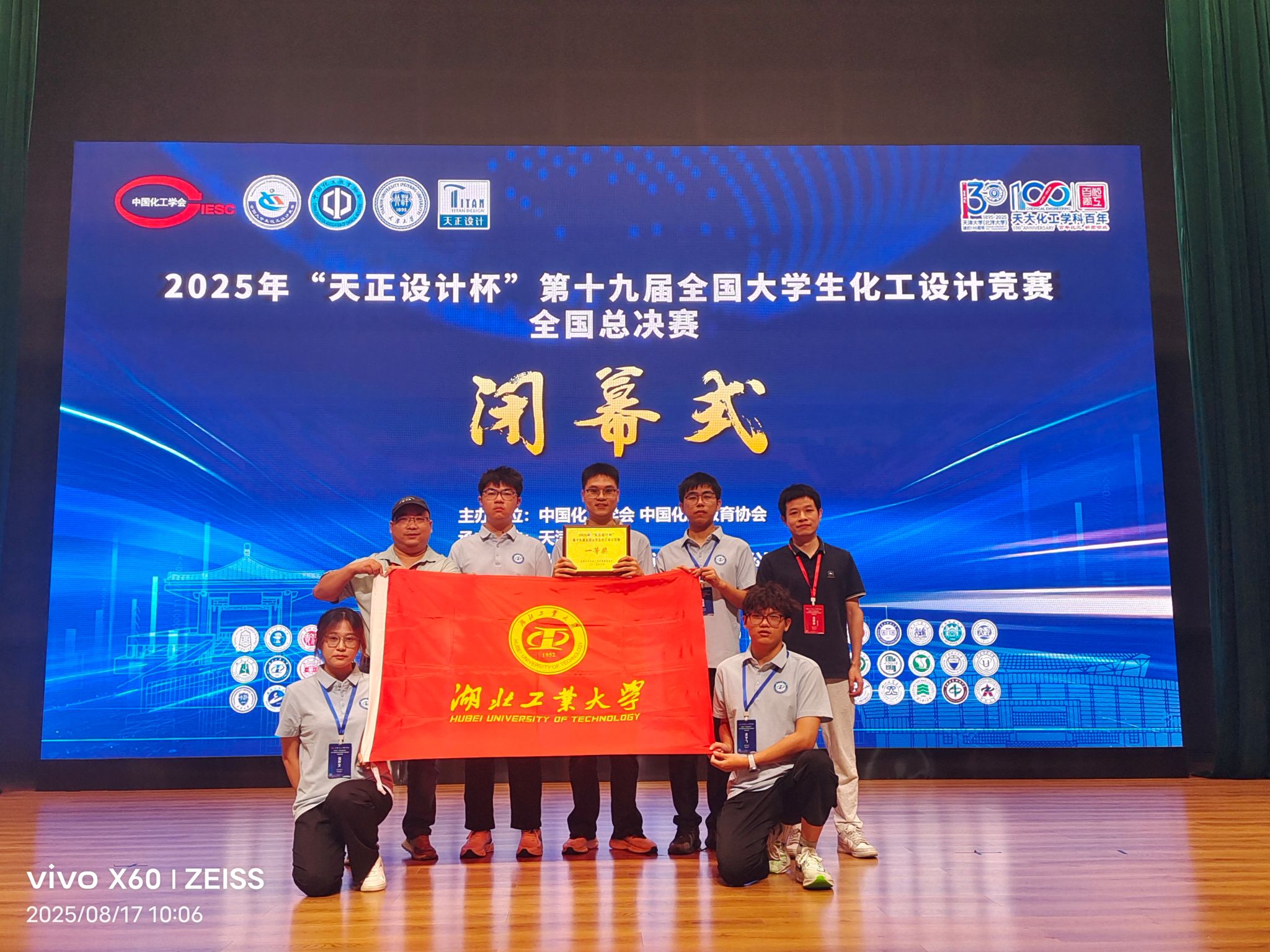 2025年8月11~17日,第十九届全国大学生化工设计竞赛全国总决赛顺利举办。本届总决赛由中国化工学会、中国化工教育协会主办,天津大学承办。“湖北工业大学-卧龙砜雏”队(参赛队员:李星宇、梁宇飞、张怀文、刘卓珂、胡铭峰)在我院教师团队的指导下勇夺国家一等奖。