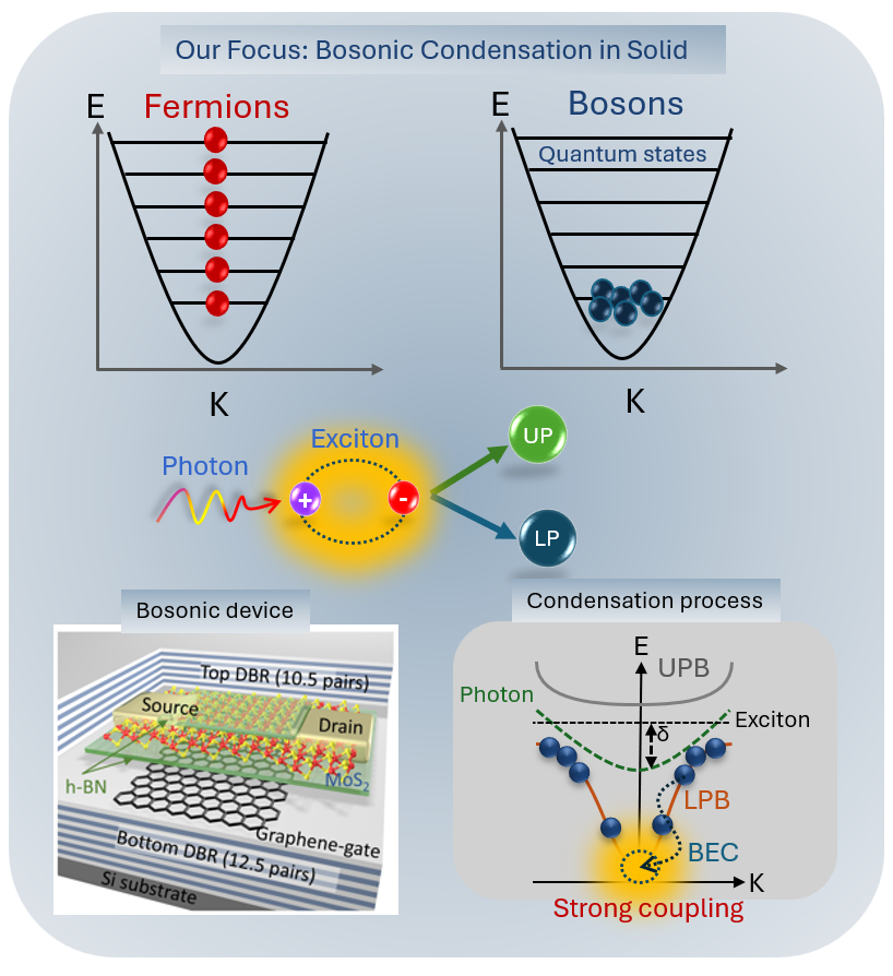 We aim to explore gate-controlled polariton engineering across different temperatures to verify the possibility of Bose-Einstein condensation (BEC) in solid-state systems using an optical approach. Our specific objectives include i) Investigating temperature-dependent BEC transitions to determine the critical temperature for condensation, ii) Enhancing polariton screening control to manipulate interactions between multiple polariton states, and iii) Developing device-level demonstrations of BEC, paving the way for scalable polariton-based quantum computing architectures. A successful demonstration of device-level Bose-Einstein condensation at room temperature would be a transformative breakthrough in the field of quantum computing and optical computing. This could lead to revolutionary advancements in quantum information processing, providing an alternative pathway to low-power, ultrafast, and highly efficient optical computing devices.