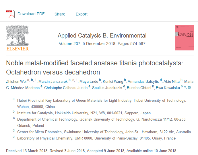 近日,材料与化学工程学院多功能粉体材料研究团队常鹰教授课题组魏志顺老师以湖北工业大学绿色轻工材料湖北省重点实验室为第一单位在光催化领域国际顶级学术期刊《Applied Catalysis B: Environmental》(JCR一区Top,影响因子11.698)上发表研究成果,报道了贵金属修饰单晶多面体二氧化钛光催化材料,该研究工作开发出了高效的光催化材料,并通过超级计算机仿真模拟与实验结果相结合指出了光生电荷在不同晶面上的迁移途径。