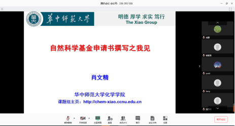 为扎实开展学院国家自然科学基金申报工作,提高国家自然科学基金项目申报质量,3月21日,材化学院特邀华中师范大学化学学院院长肖文精教授利用线上工作平台作了题为“自然科学基金申请书撰写之我见”的讲座。副校长李冬生出席会议,学院副院长胡立新主持,科技处处长武明虎、副处长向咸宁,材化学院院长李学锋,各学院教师共计100余人参加了此次线上讲座。