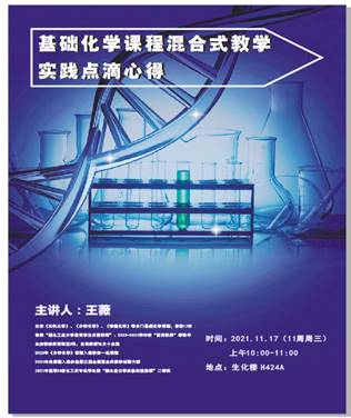 11月17日上午10点,由我院化学化工系基础化学部教师王薇主讲的第十一期校级教学沙龙于生化楼H424会议室顺利举办。王薇老师此次沙龙围绕部分基础化学课程,如《无机化学》、《分析化学》、《普通化学》等,谈到了在混合式教学实践过程中的心得体会,并从“为什么做”、“如何做”、“做得如何”等几个方面进行教学工作浅析。
