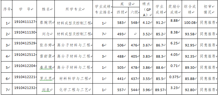 根据学校《关于做好推荐2023届优秀本科毕业生免试攻读硕士研究生的预通知》和《材料与化学工程学院2023届硕士研究生推免工作实施方案》,经学生本人申请,学院推免生遴选工作小组对材料进行复核、面试和审查,现将结果予以公示: