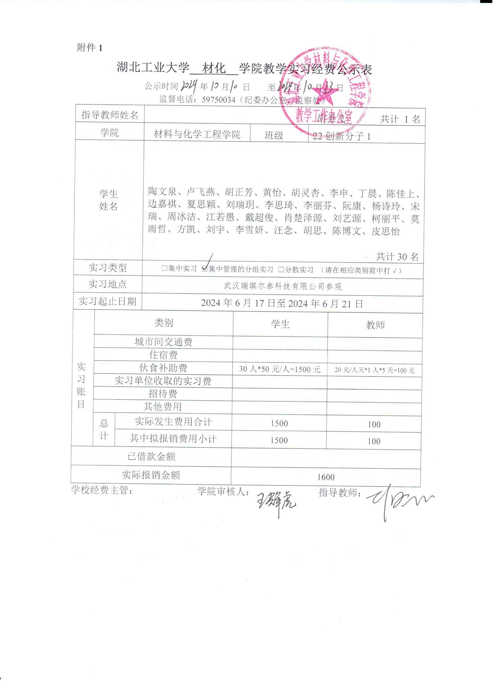 根据学校教务处、财务处关于学生实习经费使用管理的相关规定,现将22高分子专业2023-2024学年第二学期认识实习经费使用情况予以公示如下。公示时间为3天:2024年10月10日至10月13日。公示期间,广大师生可以通过电话、信函、网络等方式向学院教学办公室反映公示事项的有关情况。反映情况要实事求是,提倡实名反映,以便了解核实。联系电话:027-59750481