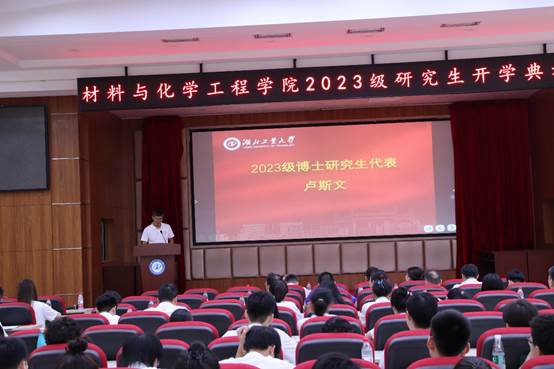 2023级博士研究生代表卢斯文分享了自己与湖工的不解之缘,勉励新生们“看脚下、不断行、莫存顺逆”。